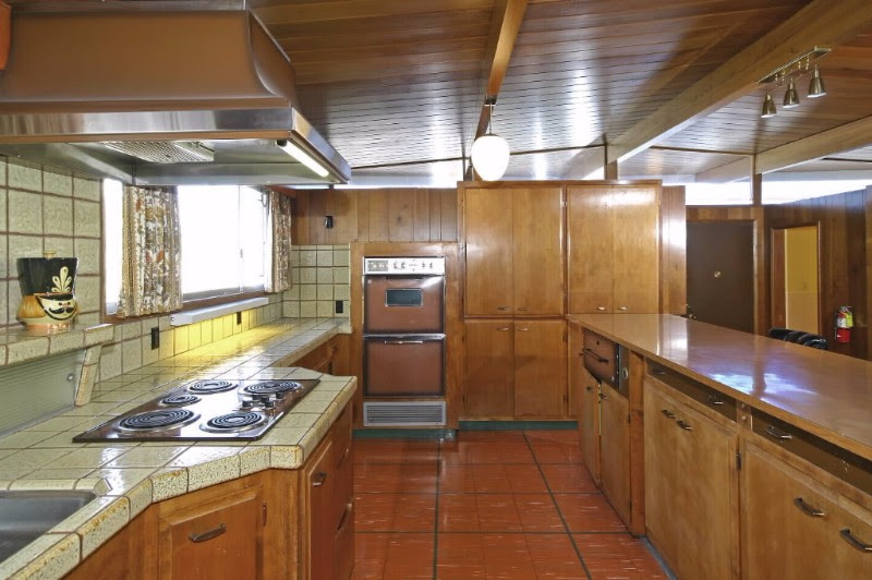 The kitchen features a number of mid-century antique copper colored appliances and conveniences such as lazy Susan cupboards, a special Mixmaster platform cabinet, and a bread warming drawer oven.